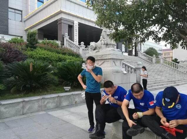 到达流沙河镇已是傍晚6点多,在等待相关工作人员对接的间隙,队员们开始了晚餐―――出发前自带的路餐食品。