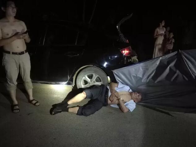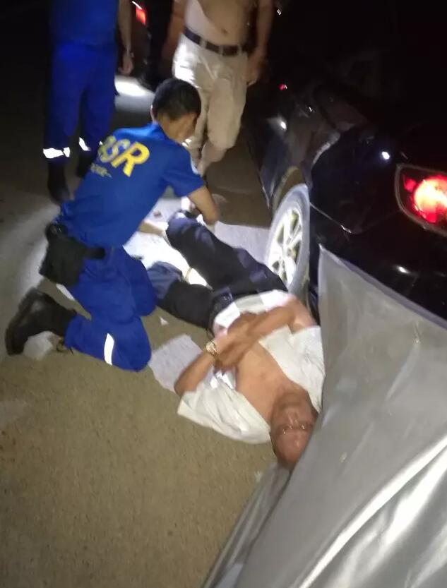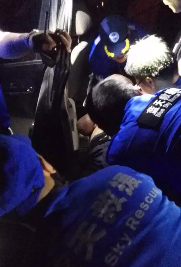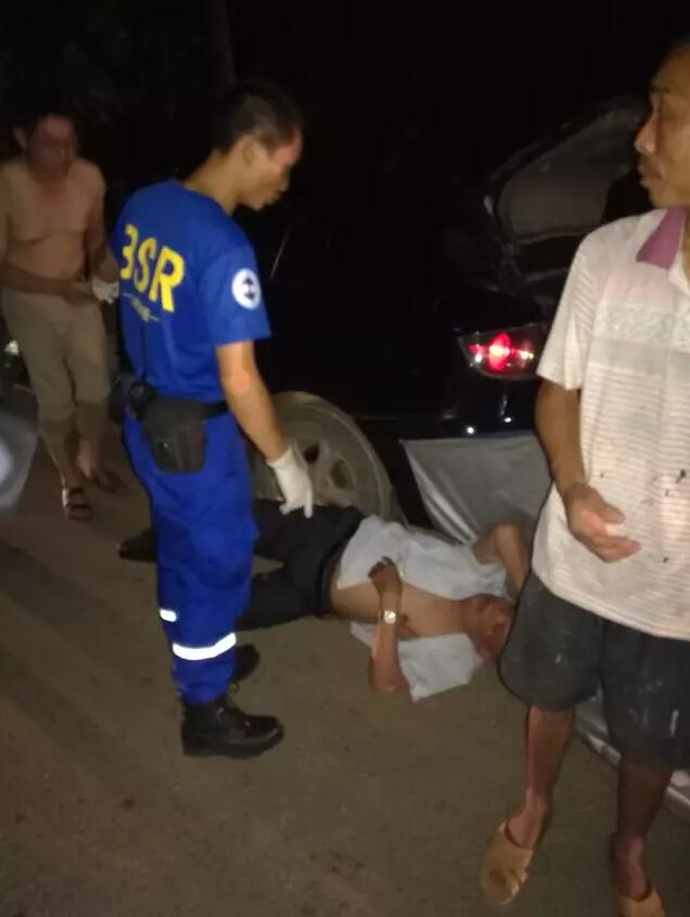 卸完物资时天色已晚,在和同行的王老吉公司工作人员告别后,蓝天队启程往长沙赶,目的地―――湘江大堤。一名队友上车后就一直捂着肚子,一问才知道是结石发作了,原来他是一直忍着结石的疼痛在干活,不想让队友为他担心。 返程途经老粮仓与灰汤之间的一个地方时,遇到堵车,原来前方发生了一起车祸,一辆摩托车追尾小汽车,摩托车驾驶员躺在了路中间。因为此处也是受灾地区,道路两边都没有供电照明,四周漆黑一片。伤者如继续躺在路中间,很可能会引发二次伤害事故。金队随即指挥队员们下车进行救援,一队人员指挥交通,一队人员对伤者进行救援和拍照取证。