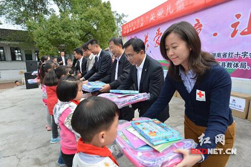 活动组织者将爱心礼包送到孩子们的手中红网时刻10月20日讯(通讯员 金辰 张琦)为了帮助大山里的孩子,为他们提供更多的机会,10月20日,由湖南省红十字会和中国水电八局联合开展的 “关爱儿童,让爱传递”爱心公益活动在湘西泸溪县新隆场镇中心完小进行。