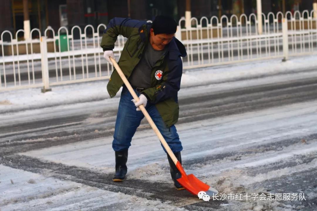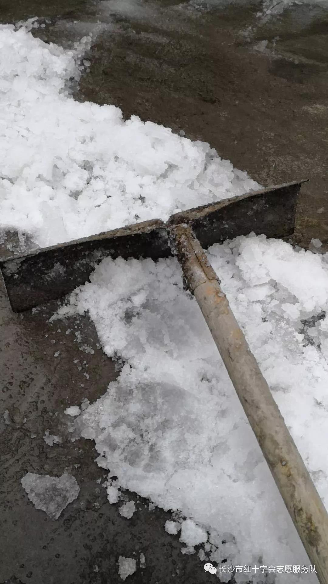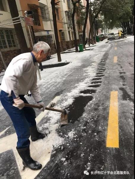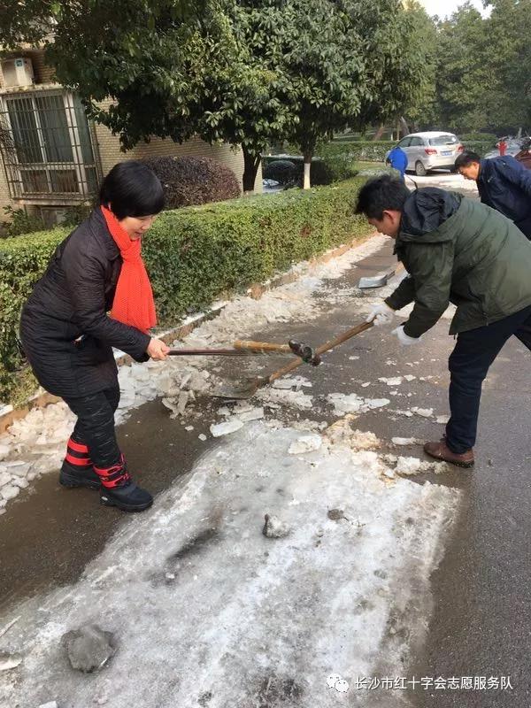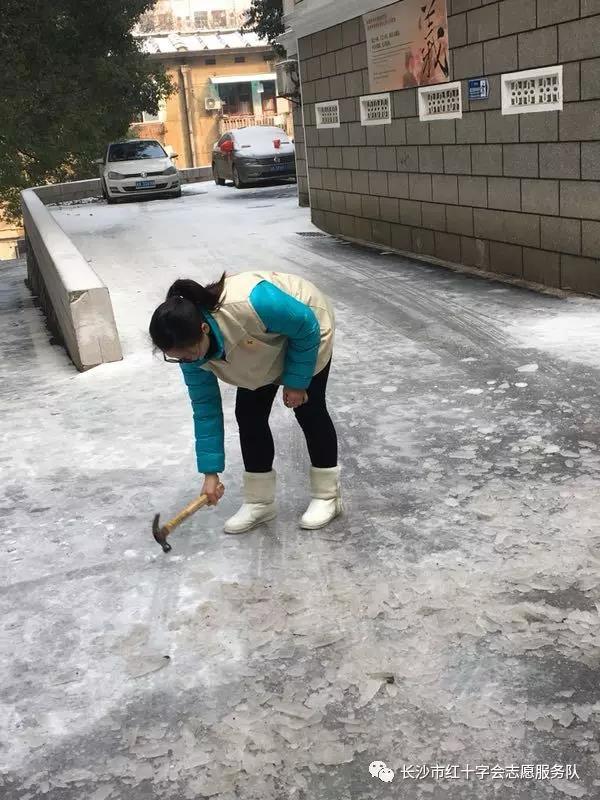 长沙市红十字会志愿服务队陈旭队长带着队员们加入到了除冰大军中。