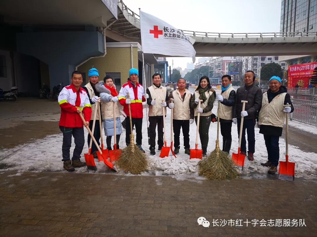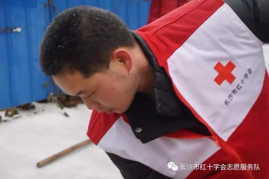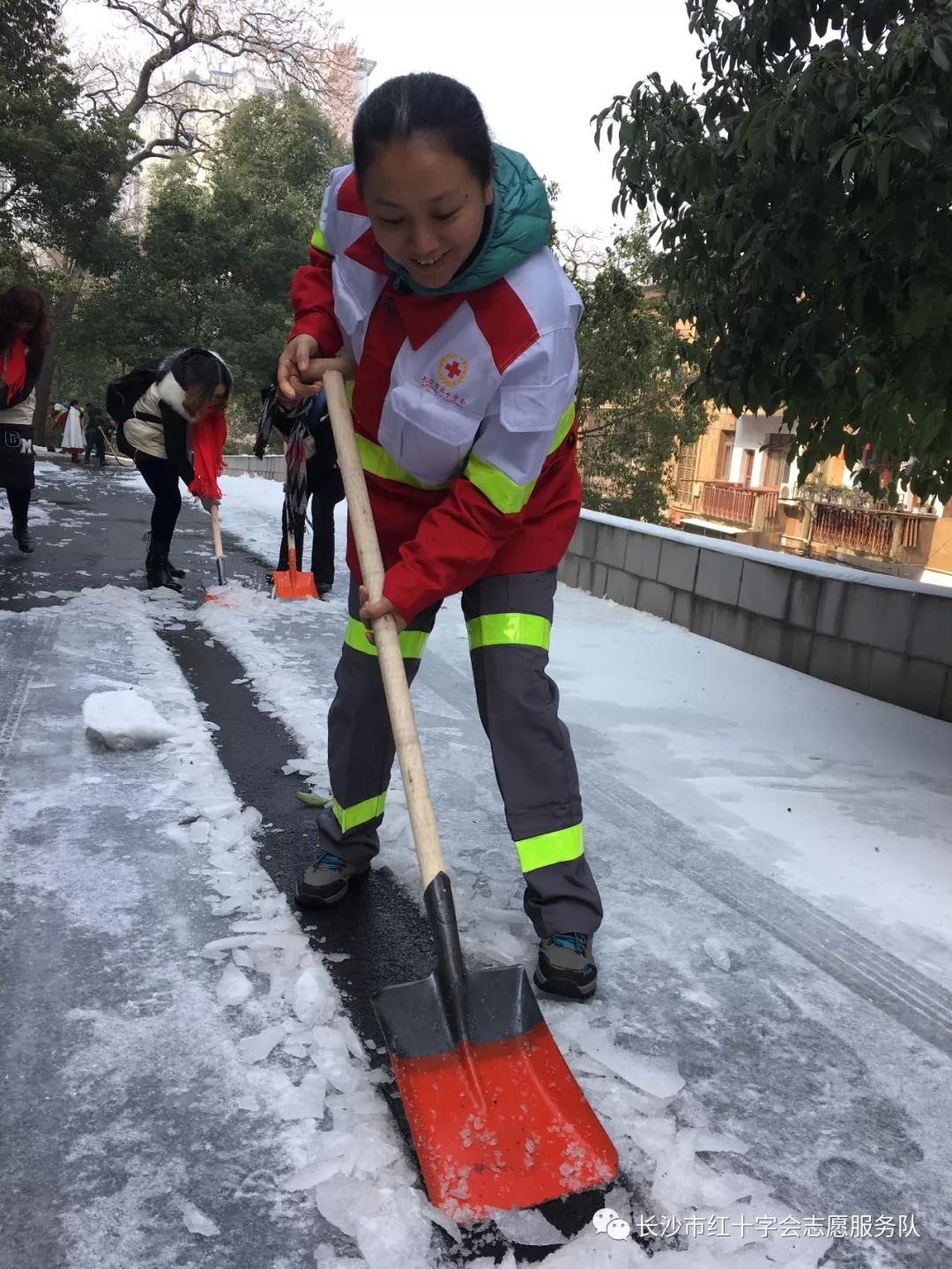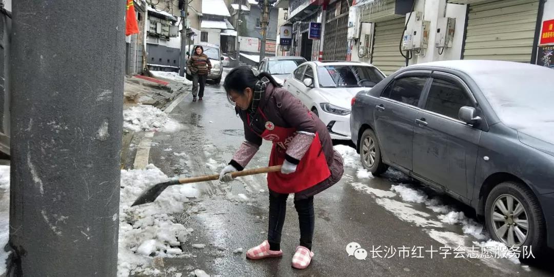 长沙市红十字会志愿服务队陈旭队长带着队员们加入到了除冰大军中。