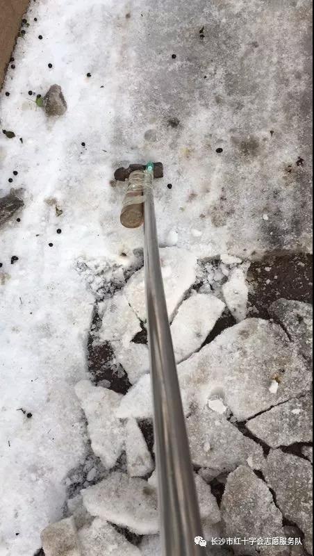 已经结冰的路面,坚硬如铁,铲起来很费力,志愿者自己想的办法。来自天心区红十字会志愿服务队的雪松姐,自制的简易砸冰锤。怎么样!牛逼吧!