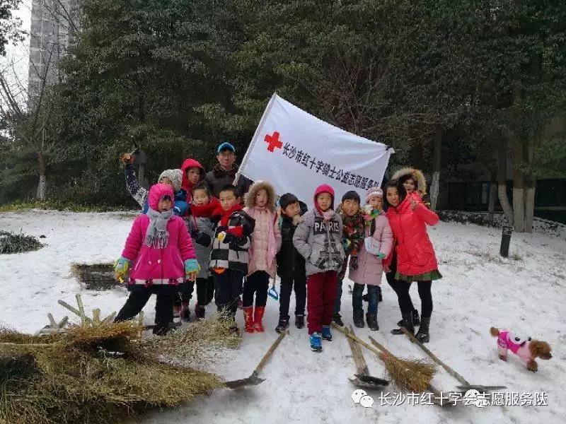 长沙市红十字志愿者团队最年轻的团队--长沙市红十字骑士公益志愿服务队也采取就近的原则,在本服务队队员居住比较集中的岳麓区云溪谷组织起刚刚放寒假的居民和孩子们投入了除冰战役中。