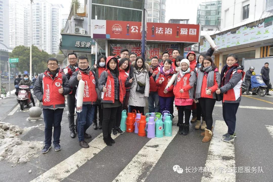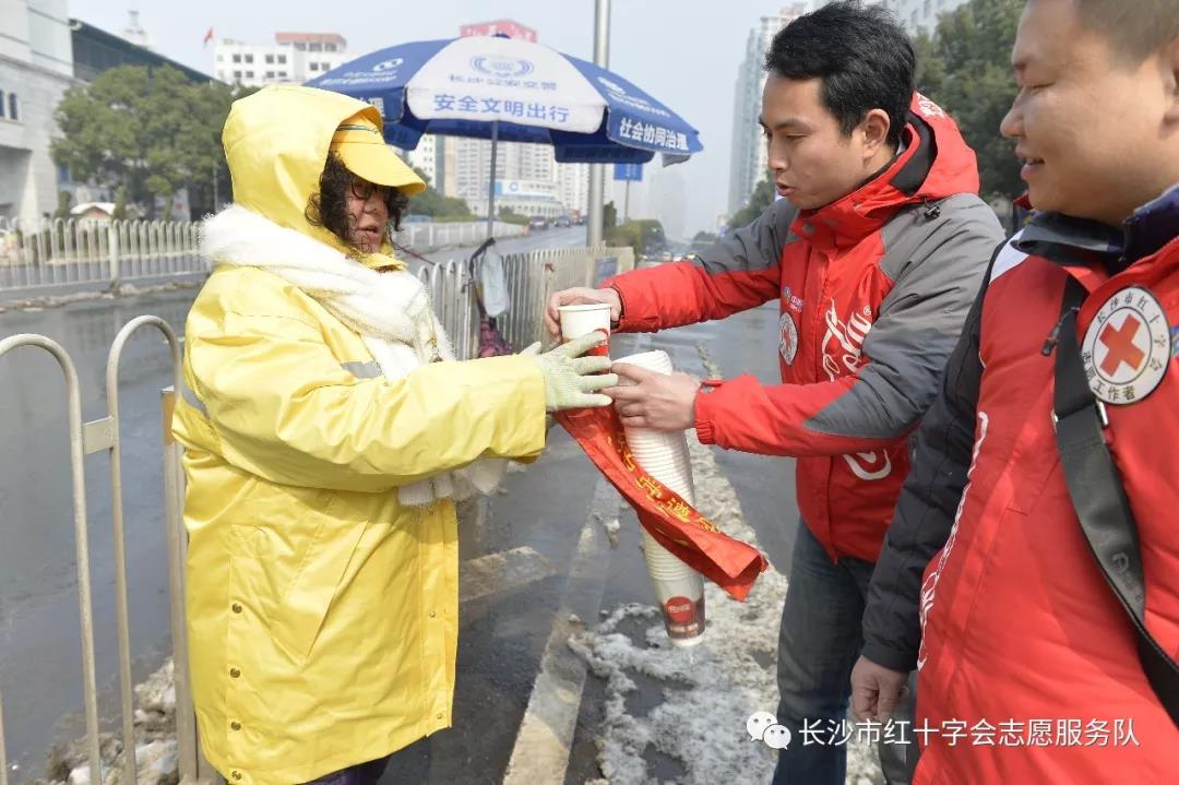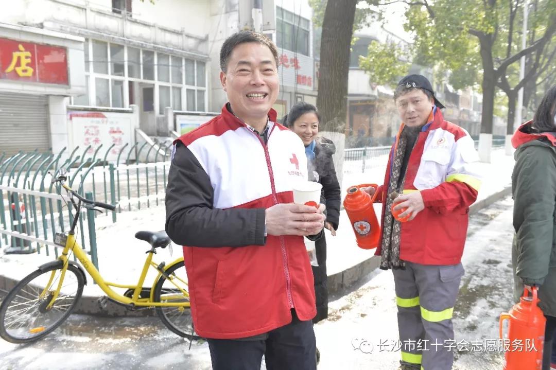 长沙市红十字会党组书记、专职副会长唐俊杰会长来到了雨花区东塘街道政院社区和红十字志愿者们在一起除冰铲雪。并走上街头亲自为志愿者和环卫工人、交通警察们送上热腾腾的可乐姜茶。