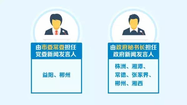 14个市州中,益阳、郴州两市由市委常委担任党委新闻发言人,株洲、湘潭、常德、张家界、郴州、湘西等6市州由政府秘书长担任政府新闻发言人。很多单位设置了两名新闻发言人,新成立的省市场监督管理局设置了4名发言人。