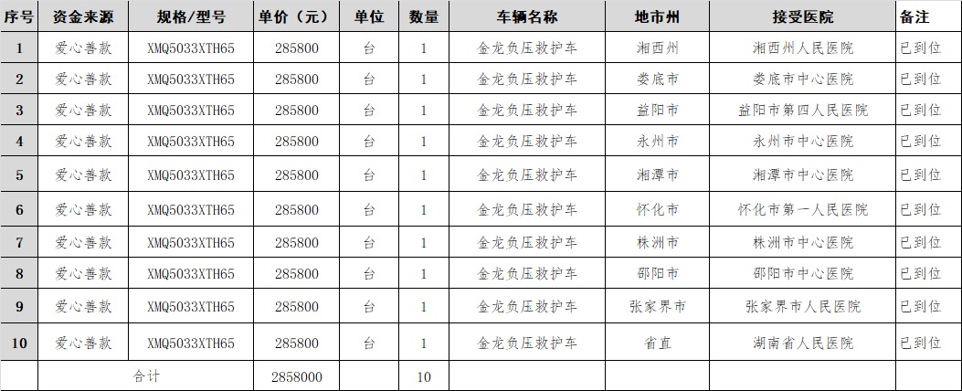 现将湖南省红十字会使用疫情防控爱心善款非定向资金285.8万元采购10台负压救护车统筹分配情况公示如下,并接受社会监督。