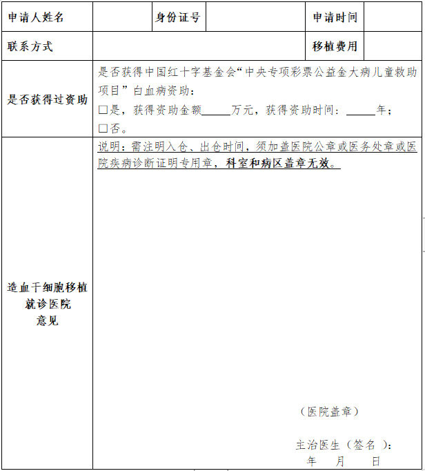 中国红十字基金会“中央专项彩票公益金大病儿童救助项目”造血干细胞移植资助申请表