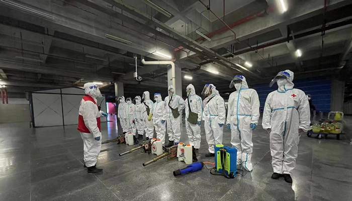 湖南省红十字蓝天救援中心志愿者队员们身着防护服、佩戴防毒面具、身背重达五十余斤的专业消杀设备,对包括公共区域、高铁站台、卫生间、旅客广场在内的逾五万平方米的公共区域,进行全覆盖、无死角防疫消杀,最大限度阻断疫情传播。