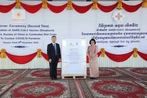 由中国红十字会向柬埔寨红十字会援助的第二批30万剂国药集团新冠疫苗于当地时间12月15日下午运抵金边, 柬埔寨红十字会第一副主席昆索达莉和中国驻柬埔寨大使馆公使衔参赞常健共同出席疫苗交接仪式。
