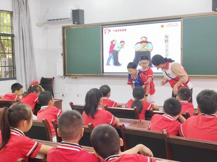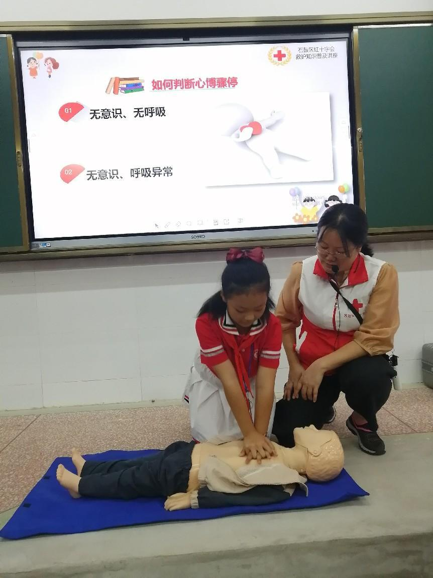 活动伊始,石鼓区红十字会培训老师采用PPT的形式将丰富的急救知识及生动的案例分享给师生们,并介绍了心肺复苏及海姆立克急救法。科普教学中,培训老师化繁为简,以寓教于乐的方式活跃现场气氛,并通过互动问答、模拟体验等方式使师生掌握正确的急救技能,在最有效的 “黄金救命时间”抢救生命。