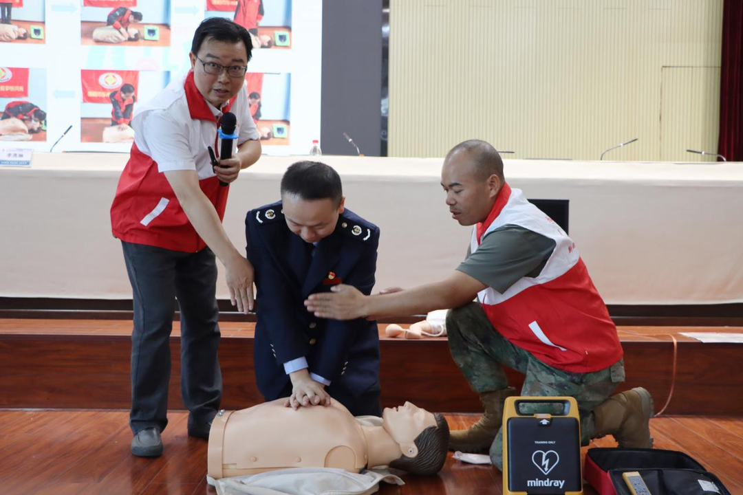 此次培训邀请了白金十分钟全国自救互救志愿者服务邵阳联盟志愿者、中国红十字救护培训师、邵阳学院附属第二医院教授李文峰进行授课。期间,李文峰紧扣应急救护重点,采用“理论+实操”相结合的培训方式,对救护新概念、常见急症出现的表征、心肺复苏、呼吸道异物急救、现场救护知识等进行了详细讲解,并通过现场模拟实践操作,为机关干部讲解心肺复苏、AED的使用和海姆立克急救法的操作技巧和注意事项。