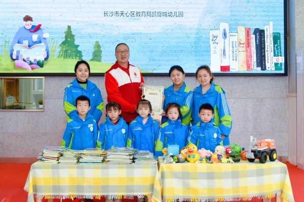 11月16日,长沙市天心区教育局凯旋城幼儿园的小朋友们将“爱心义卖”募集到的爱心款和8成新的图书,通过长沙市红十字会志愿服务队送到有需要的人的手中。