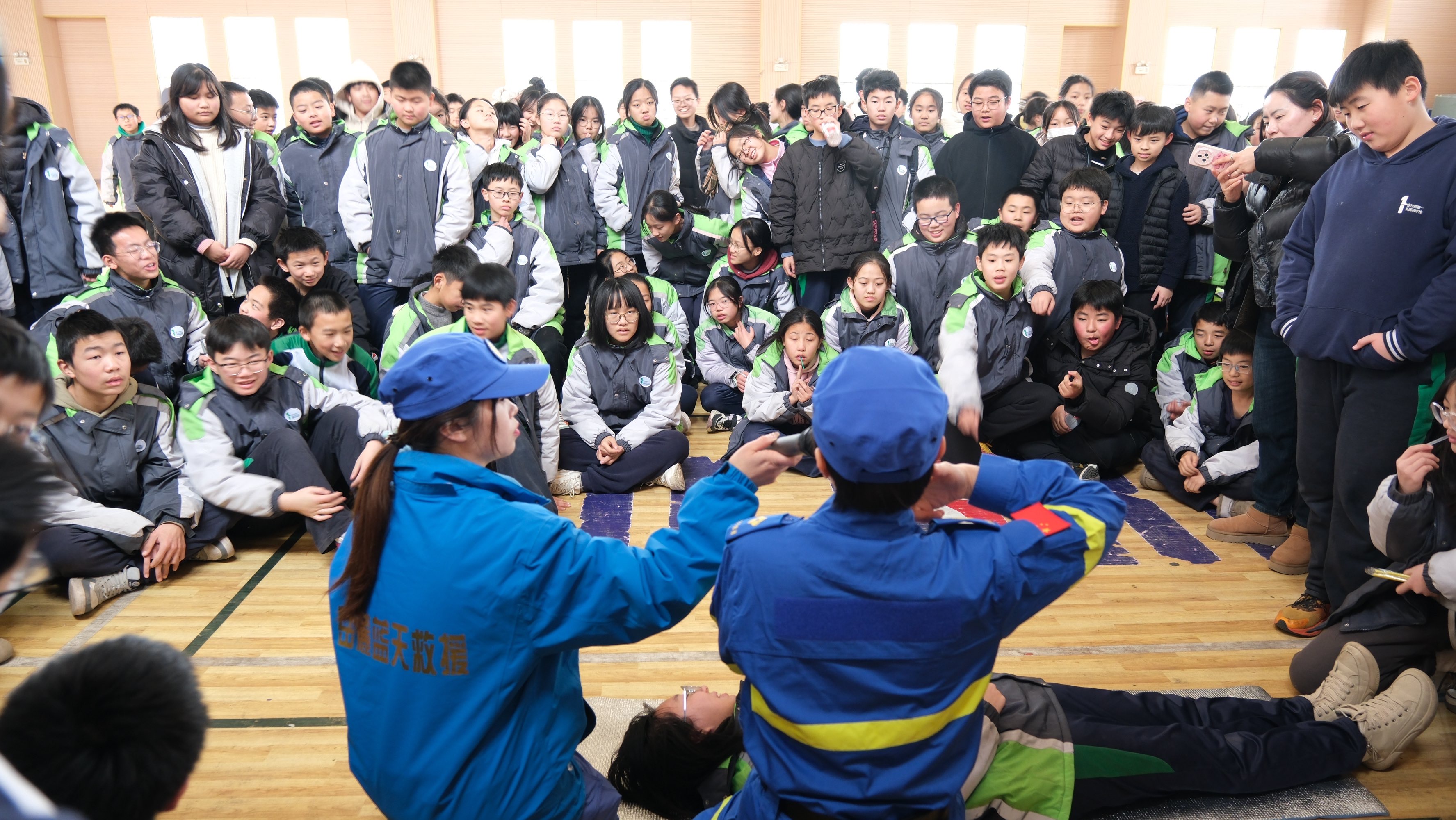 1月26日,青竹湖湘一外国语的初一3班的孩子们齐聚学校体育馆,在蓝天应急救援队教官的引领下,共同参与了一场意义非凡的心肺复苏应急处置实践活动。此次活动的目的在于提升同学们在紧急状况下的自救互救能力,进一步增强大家的安全意识。