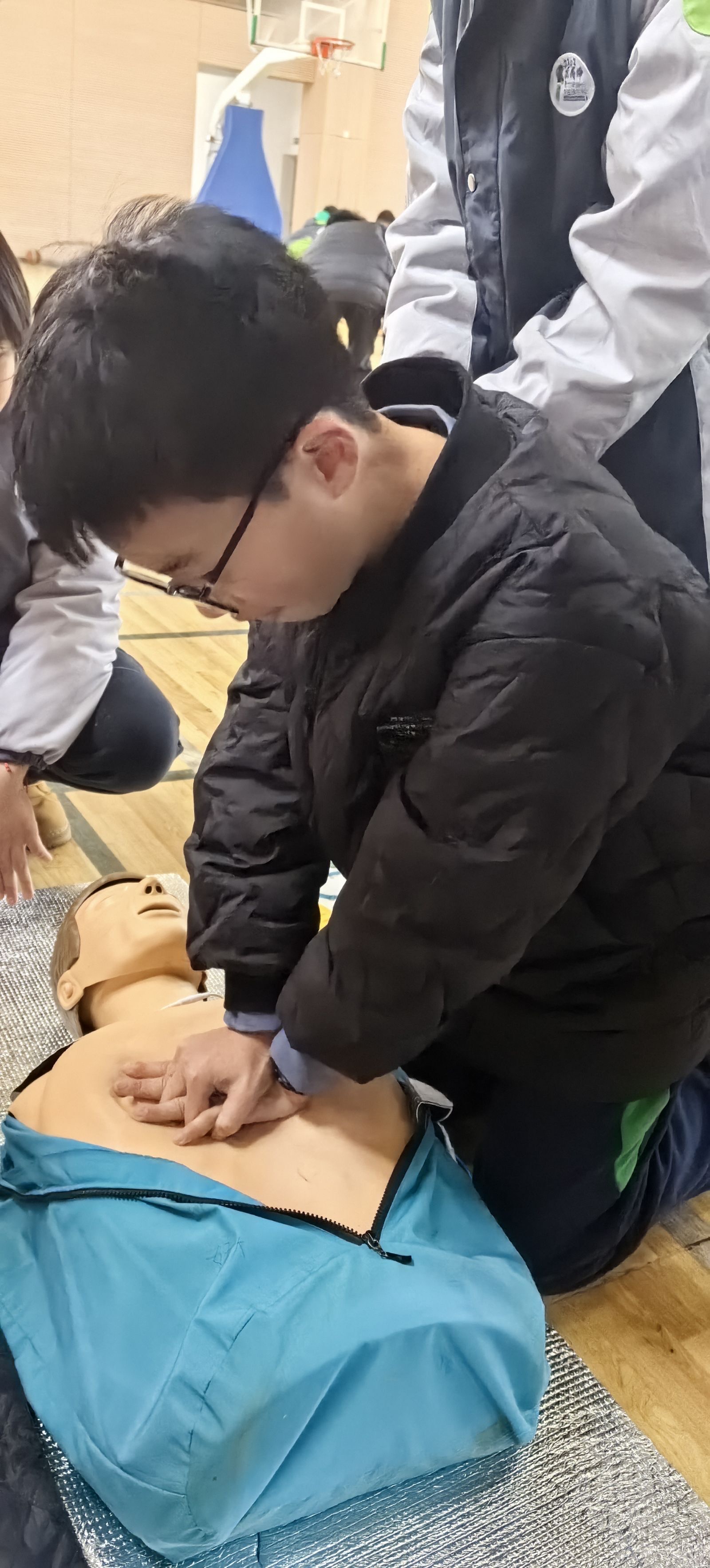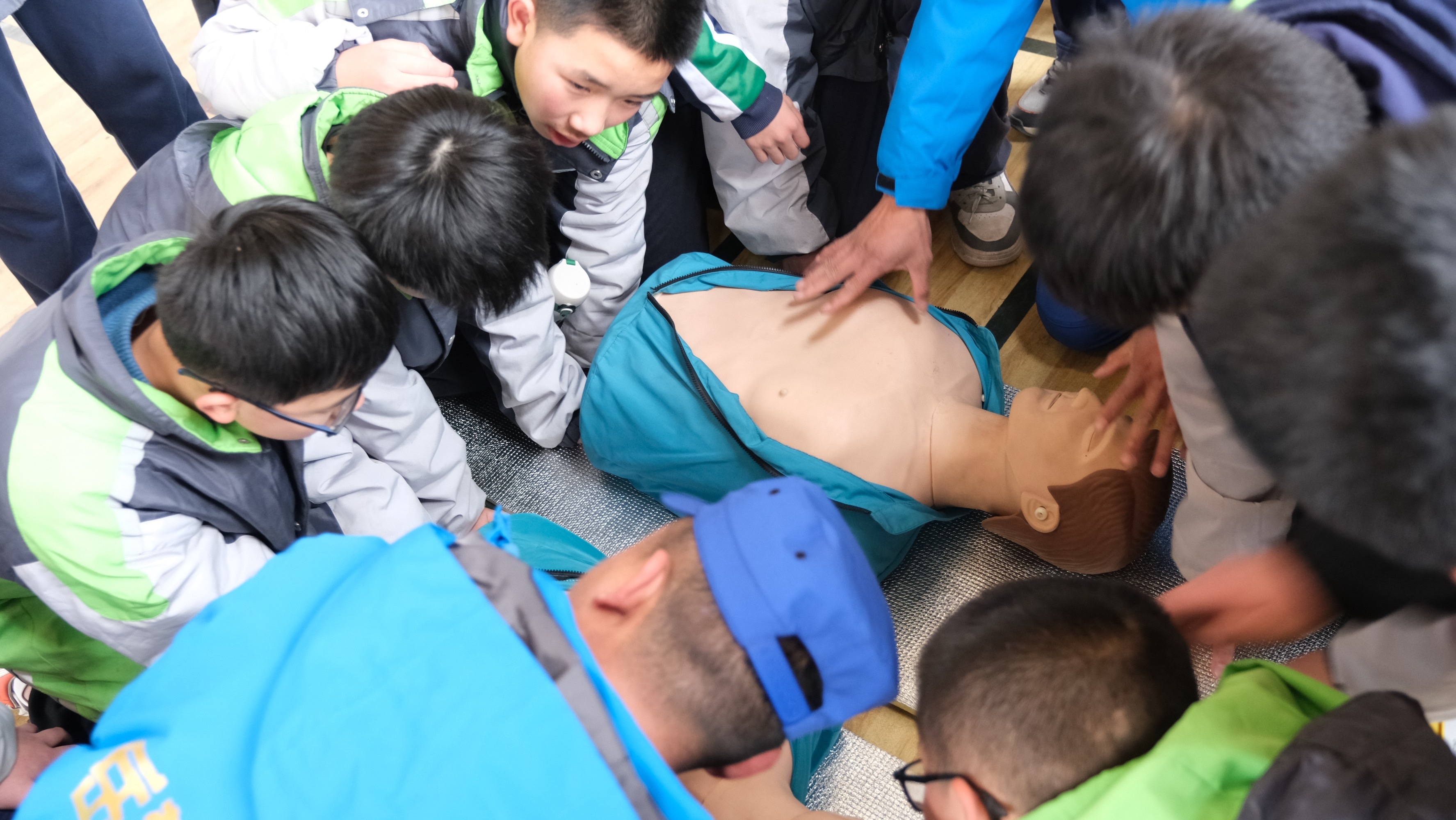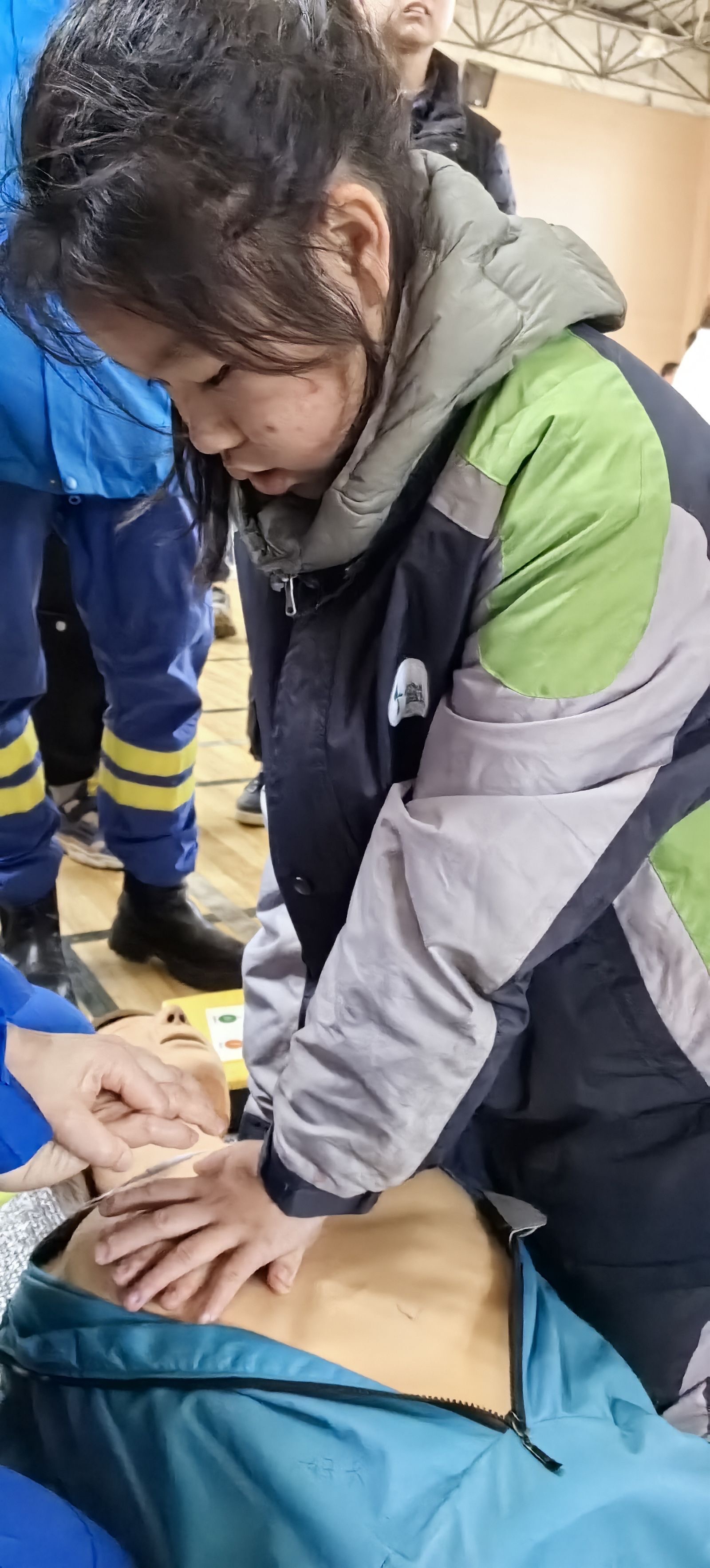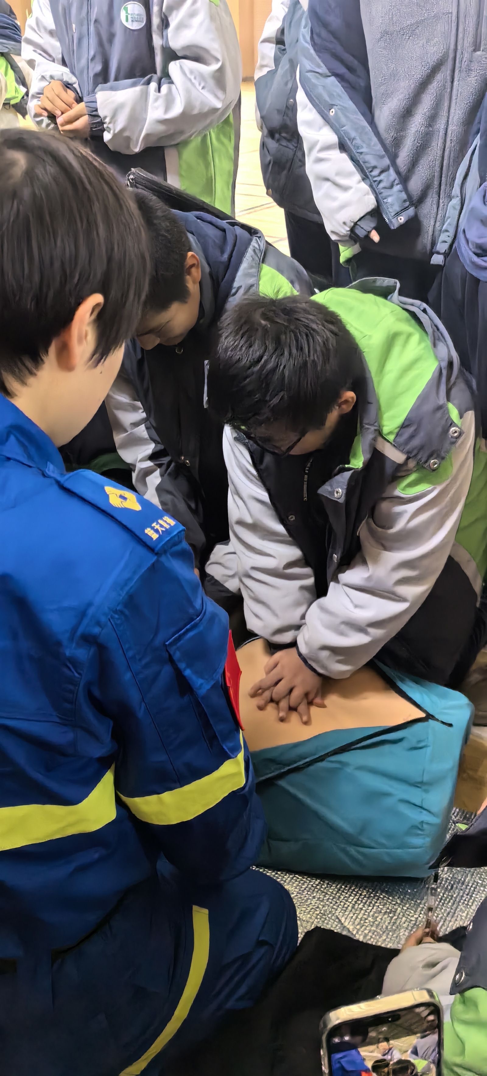 3班同学们展现出了极高的学习热情。他们全神贯注地聆听蓝天应急救援队教官的讲解,并积极参与心肺复苏应急处置的实践操作。每个同学都勇敢地一一上台演示。