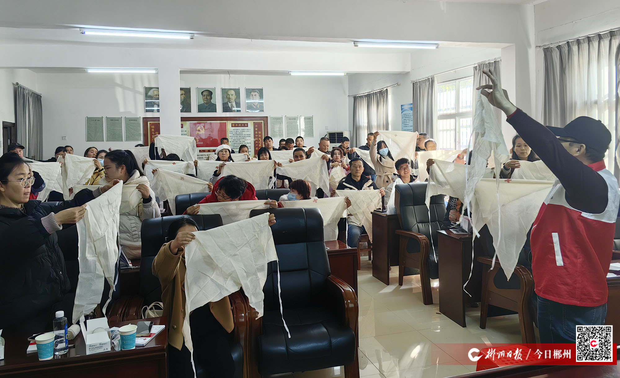 为期一天的培训采用线上、线下相结合的模式,分理论和实操两个环节。郴州市红十字会优秀救护师张小松、李丹通过PPT展示、教具演练、现场答疑、手把手指点等方式,系统阐述了红十字运动知识、心肺复苏理论与实操、体外自动除颤仪(AED)的操作使用以及创伤包扎、止血、搬运理论与实操,海姆立克急救等相关知识。