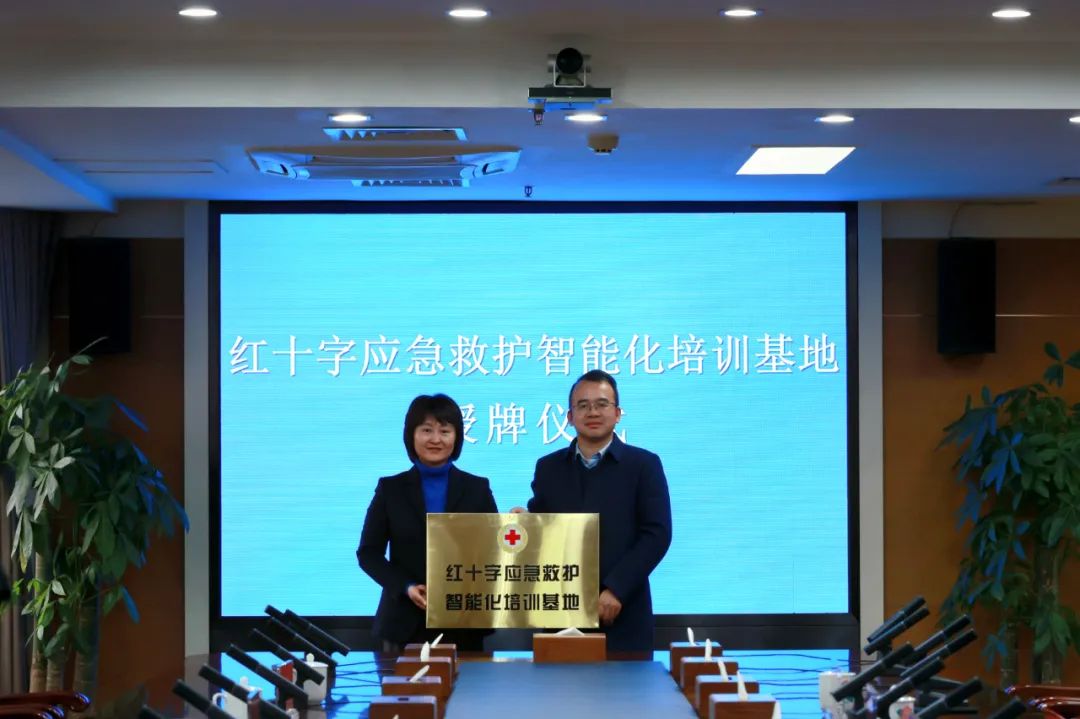 仪式现场,在各位领导来宾的见证下,伍英为应急救护智能化培训基地授牌,芙蓉区卫生健康局党委书记、局长田松柏接牌。