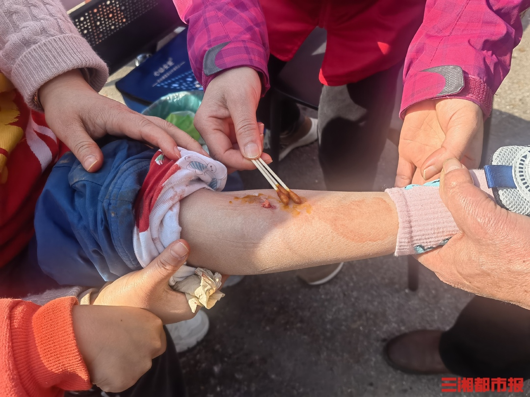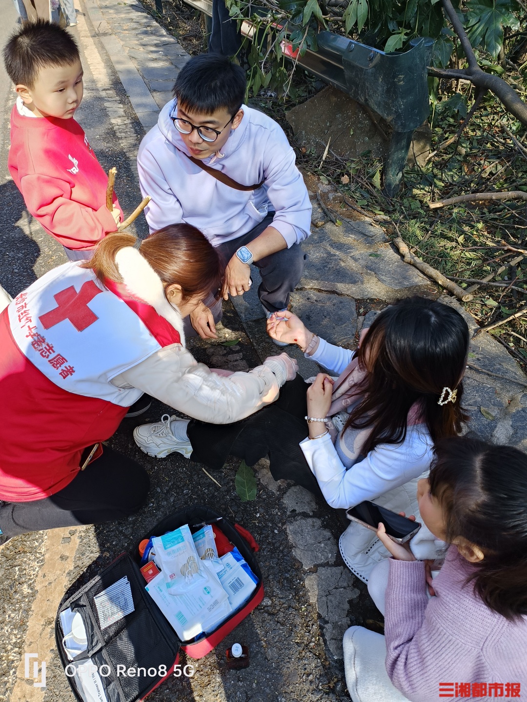 “你好!我老婆刚摔了一跤坐在地上了,手和脚都出血了,请问你们能不能去帮她处理一下。”中午,岳麓山景区红十字救护站的师资志愿者接到了来自上海游客的求助。