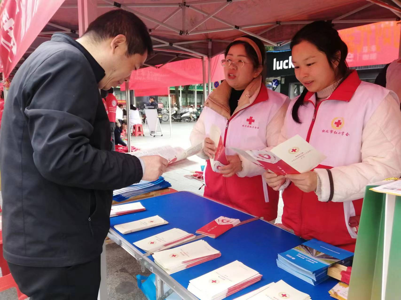 红十字会工作人员为群众发放红十字相关法律法规宣传资料。