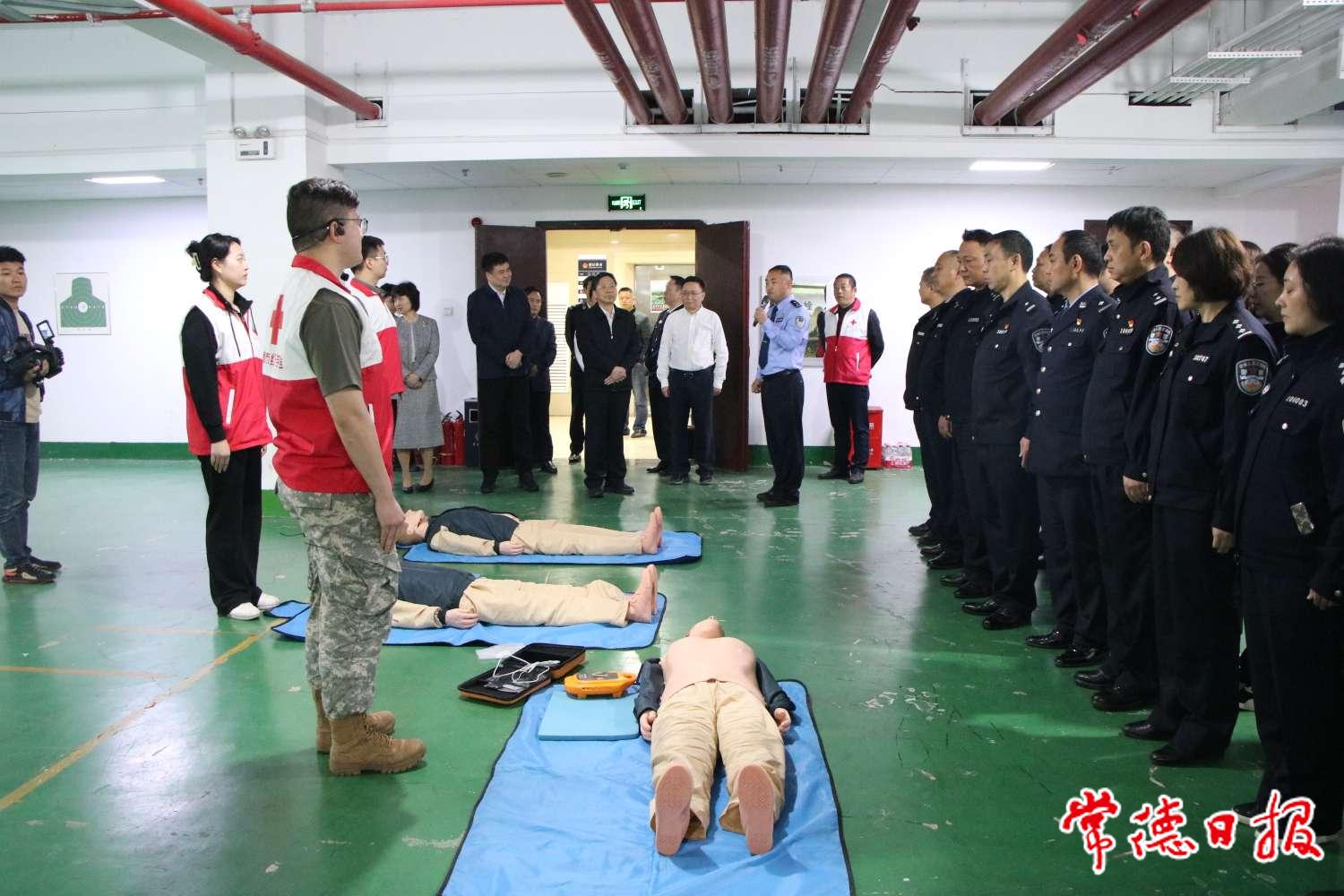 常德市公安局警官培训中心联合常德市红十字会成立红十字应急救护培训基地,充分发挥各自优势,深化战略合作,把民警现场急救训练纳入民警培训必修、必考课目,以《公安民警训练大纲》《警务实战基础训练教程》等为依据,确定了心肺复苏急救、常见外科急诊急救等5个训练课题,累计培训民警学员达5000余人次,实现了资源共享、共赢发展,共同打造地区人道服务新品牌。