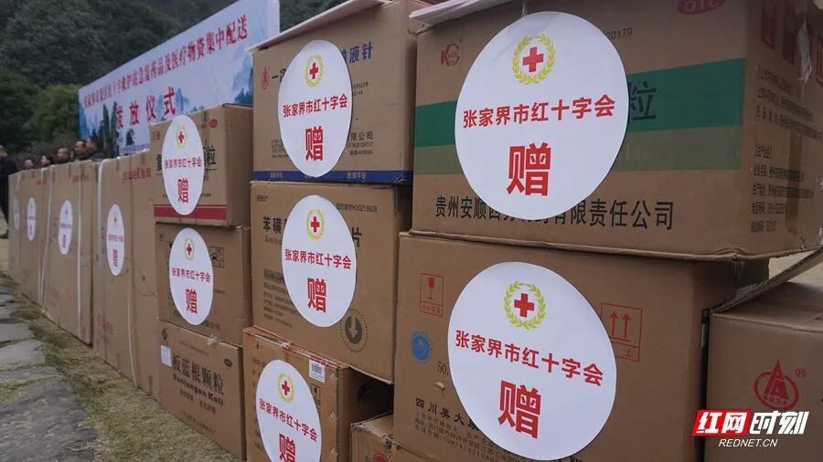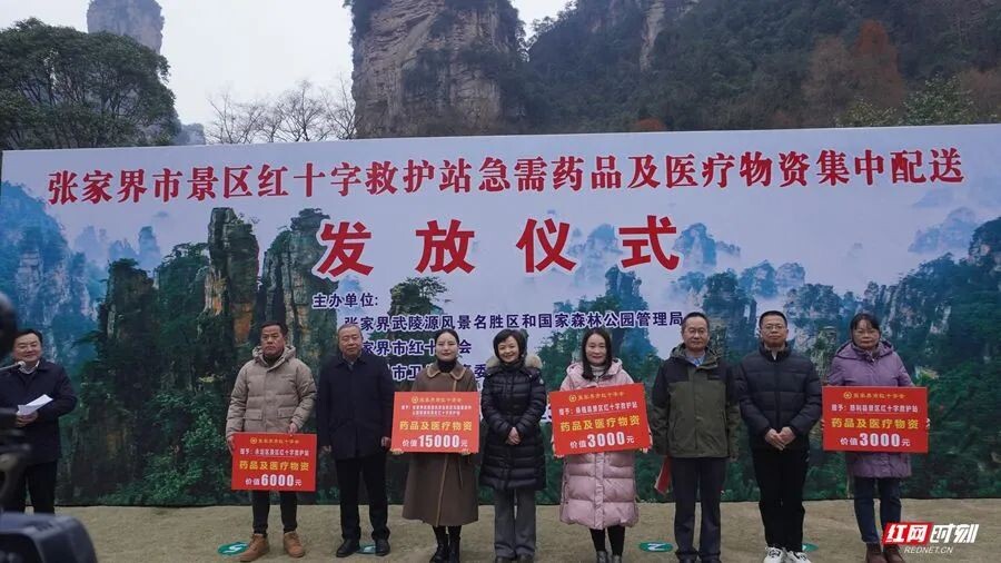 12月23日上午,张家界市景区红十字救护站急需药品及医疗物资集中配送发放仪式在张家界国家森林公园大氧吧广场举行。