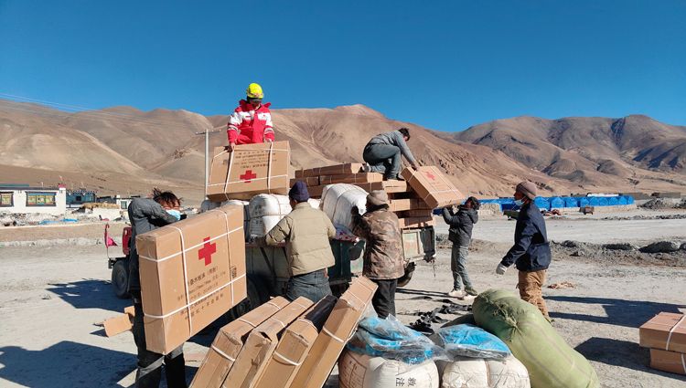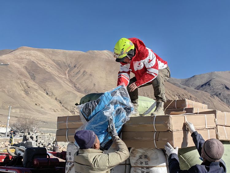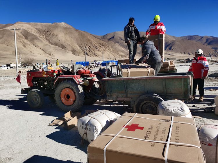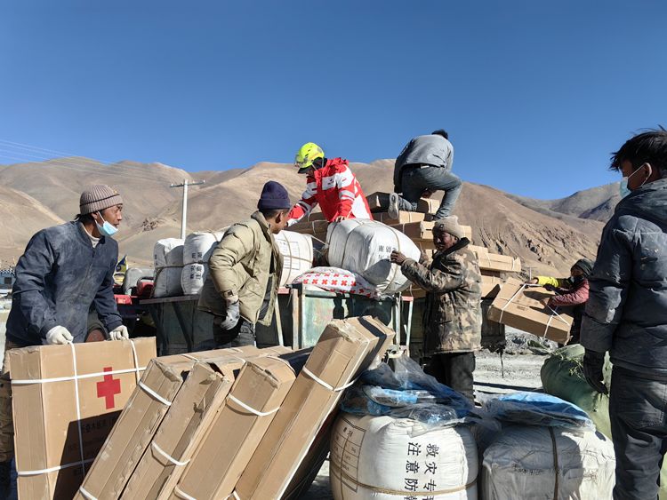1月8日,西藏日喀则市定日县长所乡强嘎村,村民们收到中国红十字会总会的救灾物资。据新华社消息,记者8日从中国红十字会总会获悉,根据西藏地震救灾工作需求,中国红十字会总会7日22时向西藏定日县地震灾区调拨第二批救灾物资,主要包括救灾棉帐篷、棉被、折叠床、赈济家庭包(箱)共计4300件(套),用于灾区受灾群众转移安置工作,增派赈济、大众卫生等3支红十字救援队伍50余名队员,携带供餐车、营地车、通讯指挥车等保障装备赶赴灾区开展救援救助工作。其中,红十字大众卫生救援队携带200套拼装式救灾卫生厕所,可用于解决紧急阶段1万余名受灾群众的卫生如厕需求。首批4600件(套)救灾物资已于8日凌晨1时起陆续运抵定日县、拉孜县,当地红十字会正在组织群众转移安置及物资发放工作。