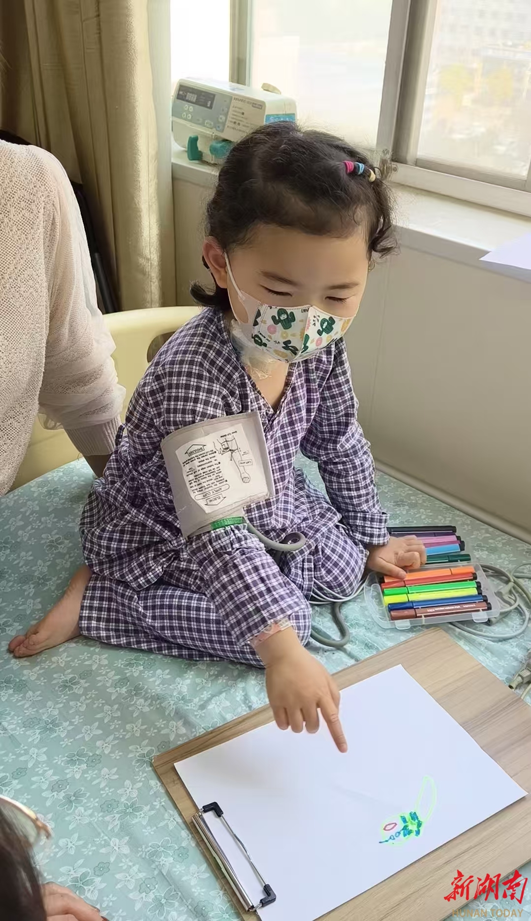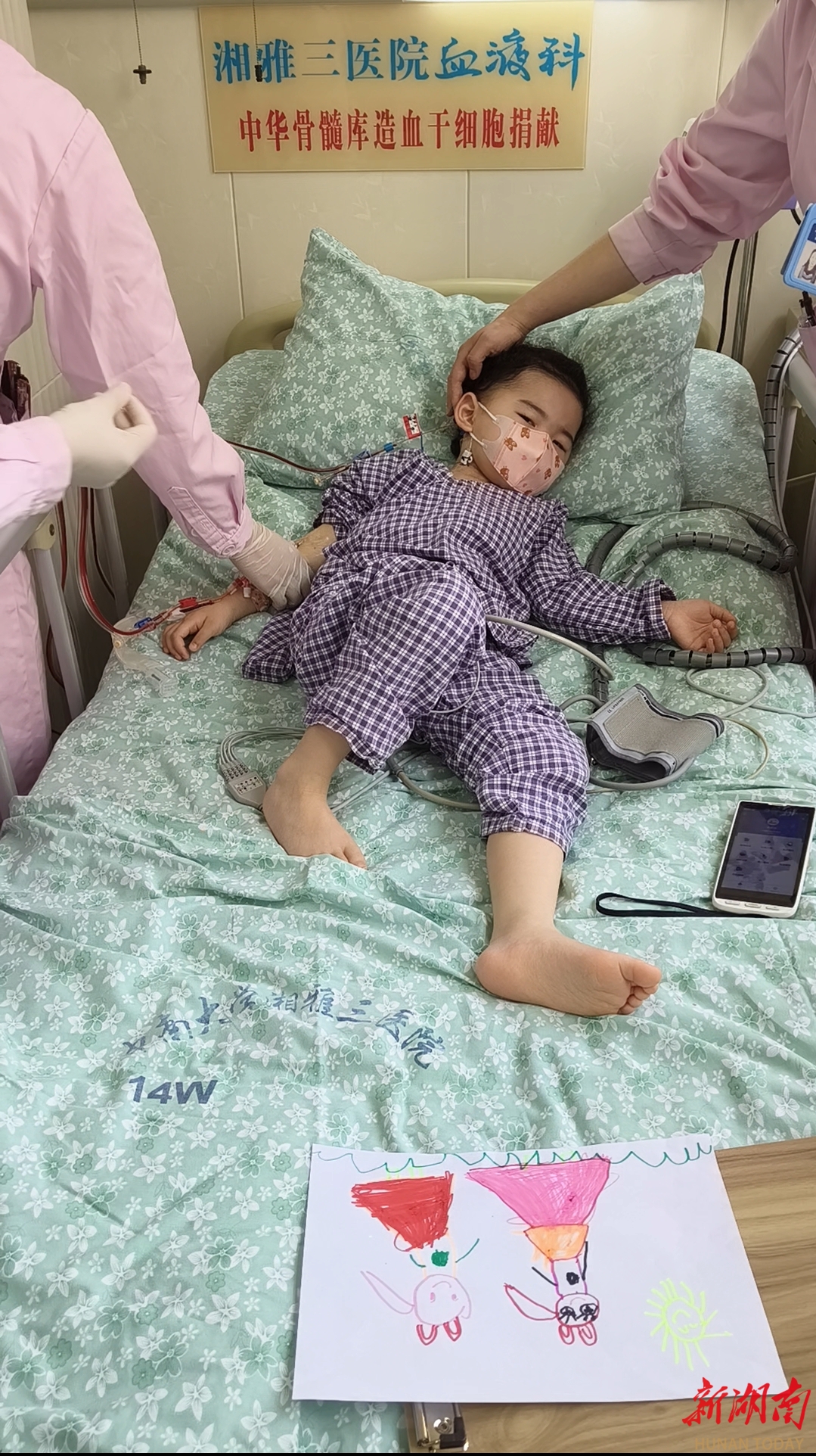一对年仅4岁半的同卵双胞胎姐妹,在医护人员的陪同下,一边拿着画板坐在床上画画,一边通过外周血干细胞分离机为身患急性白血病的母亲捐献造血干细胞。