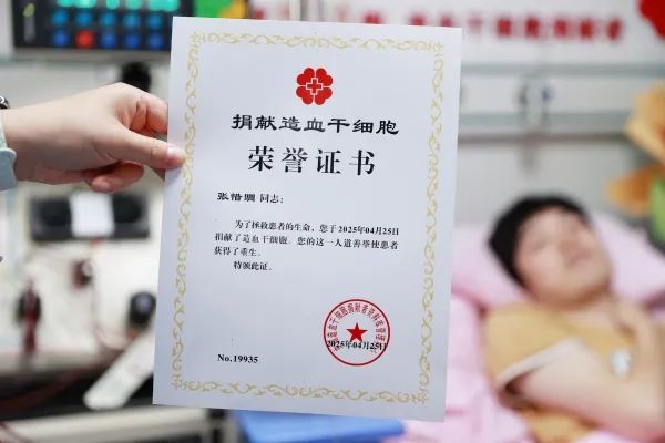 2018年,还在上大学的张惜赒第一次参加无偿献血,并报名加入中华骨髓库。“多一份样本,患者就多一分希望。”张惜赒说道,“也没想到当时种下的一粒种子,在7年后会开花结果。”截至目前,张惜赒已5次踊跃无偿献血,累计献血量1800毫升。