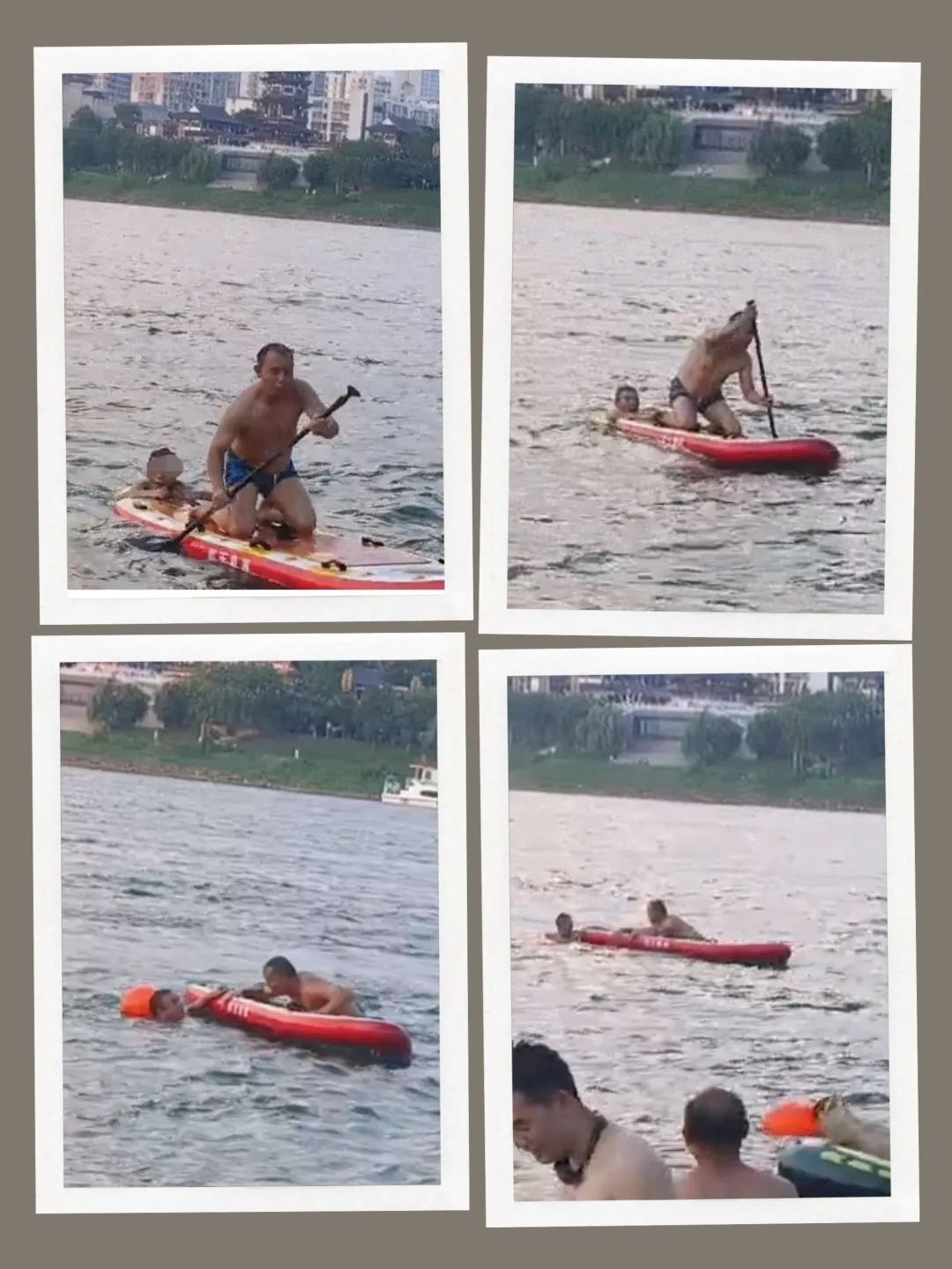 一小时后,同一地点两名游泳者因体力透支被困湍急江中,连声呼救。千钧一发之际,队员李超拿起救援桨板,两次冲入水中,稳稳地将两人逐一拖带至安全岸边,化险为夷。