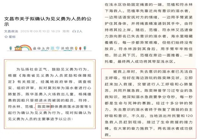 2025年6月10日,海南月亮湾风急浪高,一名游客不幸被离岸流卷入深水区,被救回岸边时已失去意识。危急时刻,正在当地游玩的湖南劳动人事职业学院教师陈奕琳挺身而出:“我学过专业急救,让我来!”她迅速跪地,按照规范流程清理呼吸道、进行人工呼吸和胸外按压,口中清晰计数着按压节奏。经过十多分钟的不懈努力,溺水者终于恢复了自主呼吸。待120急救人员抵达后,陈老师便悄然离开现场。