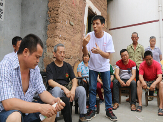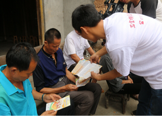 湖南省红十字会人体器官捐献中心志愿者易俊正为村民分发器官捐献知识宣传册
