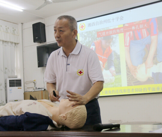 湘西州红十字会秘书长胡丕勇正在讲课