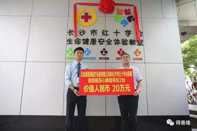 北京德美瑞医疗设备有限公司向长沙市红十字会捐赠价值人民币20万元的腹部提压心肺复苏仪两台。