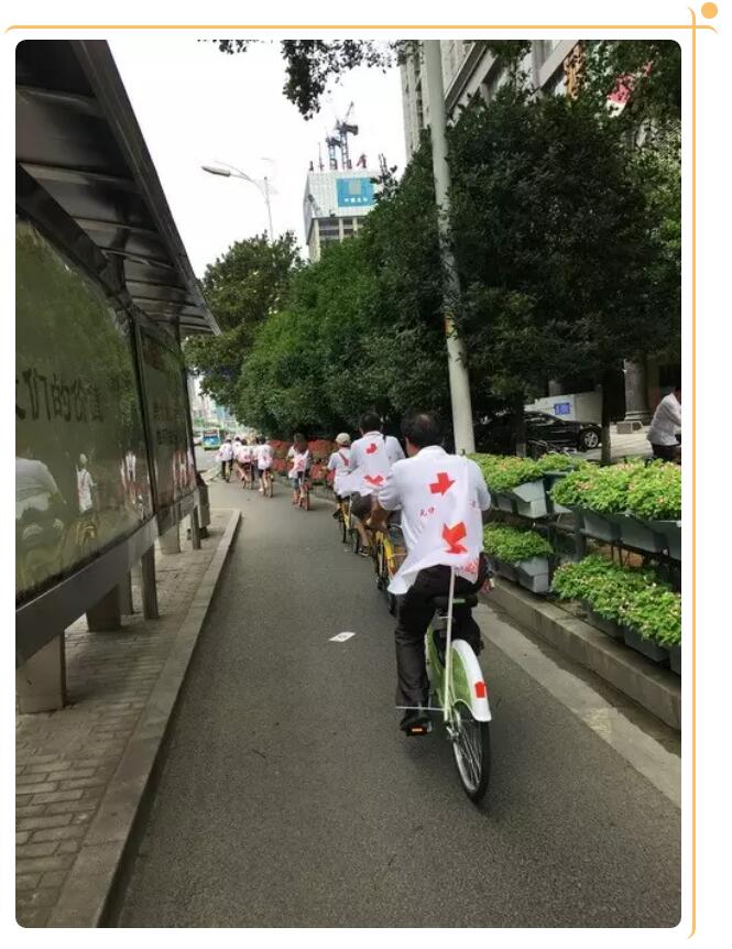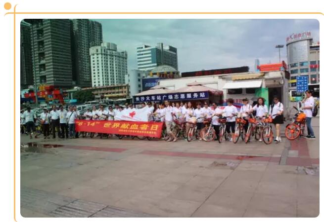 同时30多名志愿者骑着插上“湖南省红十字会无偿献血志愿服务队”旗帜的共享单车,在五一大道、芙蓉广场、解放路、八一路、晓园路、韶山路环绕骑行20多公里,进行了绿色环保的无偿献血宣传,活动持续4个小时,发放宣传单3600多份,同时引导市民共30余人成功献血,当日上午献血量达12000毫升。