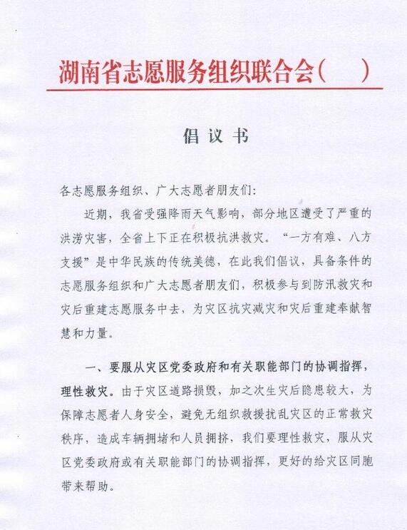 近期,我省受强降雨天气影响,部分地区遭受了严重的洪涝灾害,全省上下正在积极抗洪救灾。“一方有难、八方支援”是中华民族的传统美德,在此我们倡议,具备条件的志愿服务组织和广大志愿者朋友们,积极参与到防汛救灾和灾后重建志愿服务中去,为灾区抗灾减灾和灾后重建奉献智慧和力量。
