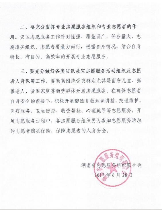 三、要充分做好各类防汛救灾志愿服务活动组织及志愿者人身保障工作。