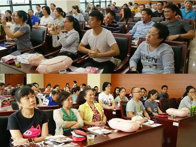 老师演示讲解婴儿气道异物梗阻的急救方法,奶爸也非常感兴趣,主动上台体验。