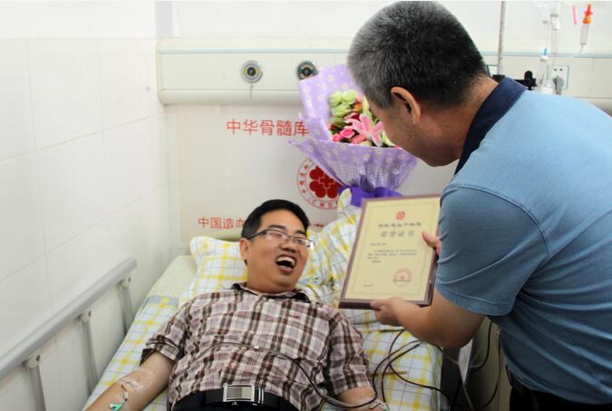教育厅 工委副书记王建华 探望采集当天,湖南省红十字会党员成员、副会长王广宇、湖南省教育厅党组成员、工委副书记王建华专程前往湘雅三医院看望慰问温老师。王广宇会长为他颁布了“捐献造血干细胞荣誉证书”,高度评价了温老师的无私奉献精神,鼓励红十字会工作者继续做好捐献服务,加大捐献者先进事迹的宣传报道,动员更多爱心人士加入到志愿捐献队伍中来,为拯救更多的血液病患者作出贡献!