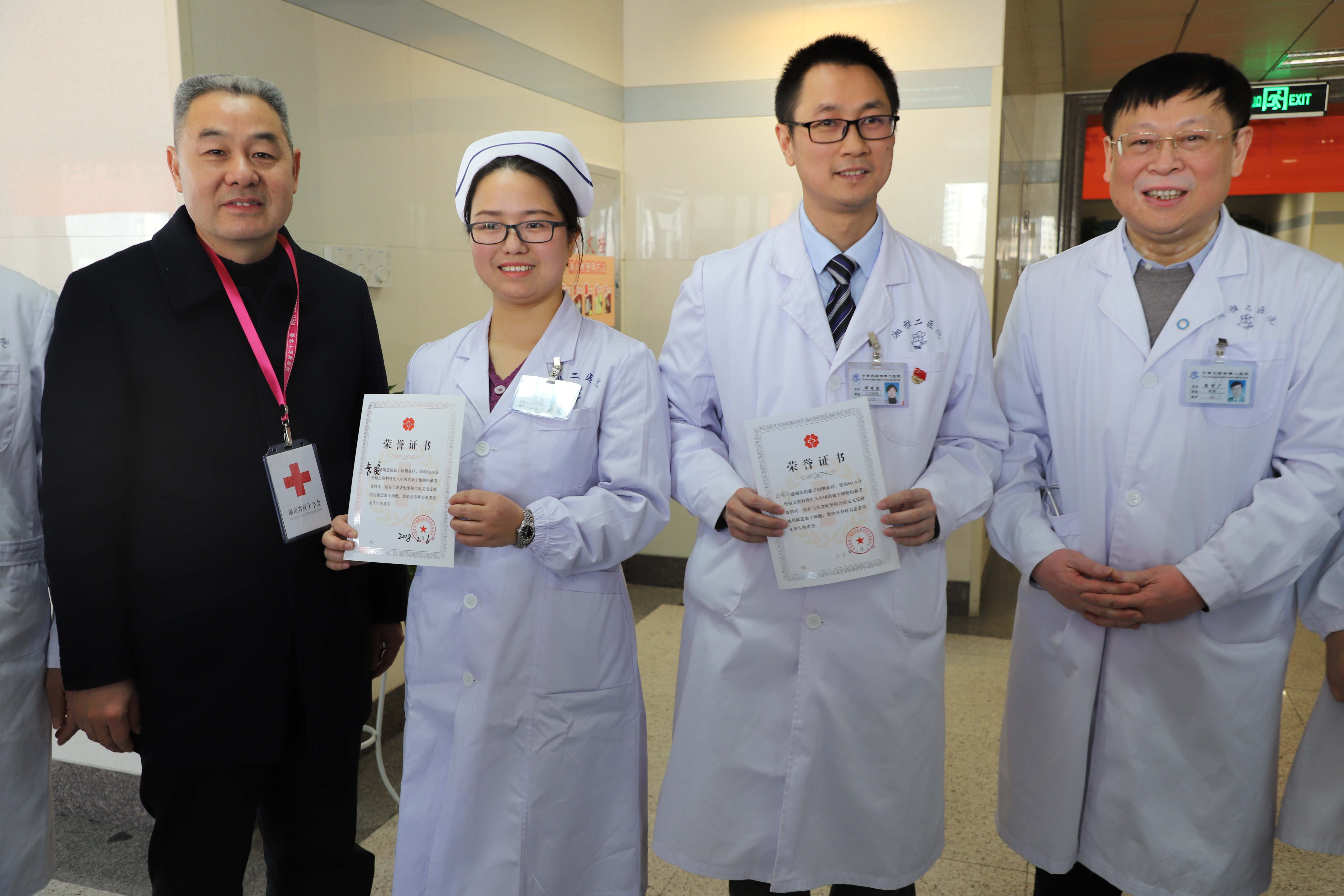 湖南省红十字会党组成员、副会长王广宇、湖南省血液中心/长沙血液中心党委书记刘艳、副主任李忠、郴州市红十字会常务副会长周洁以及长沙市红十字会、湘雅二医院相关领导到病房探望了捐献志愿者。