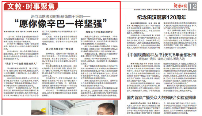 “截至2018年3月,中华骨髓库现有库容240多万,已经累计捐献7127例,湖南省库容13万多人,累计捐献490例,但这与每年新增的几万病例对比,仍然有较大差距。”张赞呼吁民众踊跃加入中华骨髓库,用自己力量帮助有需要的患者和家庭。
