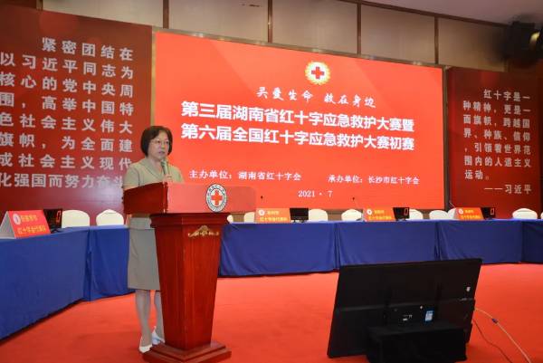 陈丹萍在比赛开幕式上指出,2021年是应急救护培训工作推进年。湖南省红十字会把开展群众性应急救护培训列为全会重点工作任务,提出了应急救护培训工作的目标,大力实施红十字救在身边行动。进行全省应急救护工作宣传和倡导“人人学急救,你行我也行”的社会文明风尚。保护人民的生命与健康是红十字会的宗旨。各级红十字会在应急救护培训激励化建设、应急救护线上线下的教学、社会资源的参与发展等方面要大胆创新,大胆作为。培训能够现场救护的救护员和按标准在公共场合配备AED已成为社会的需求和期盼,要顺应新时代人民群众对健康、安全、幸福的新需求。大力实施红十字“救在身边”行动,不断增强人民群众的获得感、幸福感、安全感。