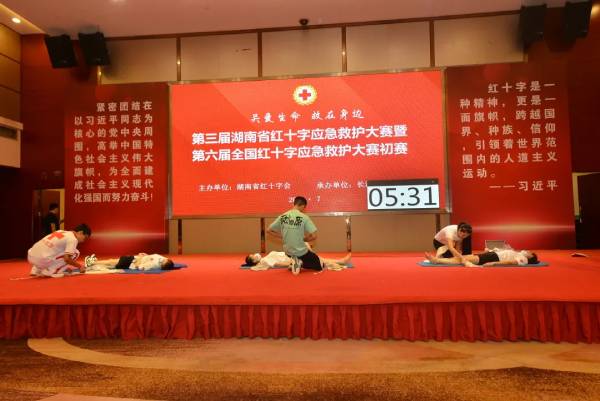 比赛分应急救护理论知识、救护演讲以及(包括心肺复苏、创伤救护等内容)3个项目进行。在场景演练比赛项目中,各市州代表团面对交通事故现场、地震灾害现场、火灾现场、踩踏现场、触电现场等模拟演练时,临危不乱,熟练地进行应急救护,合作默契,用他们的智慧和勇气,展现应急救护的能力和水平,用专业知识和社会服务经历向大家展示了湖南红十字会应急救护培训工作的精彩成果。比赛最终评选出团体奖一、二、三名等6个奖项,单项奖心肺复苏、创伤救护、救护演讲等9个奖项。