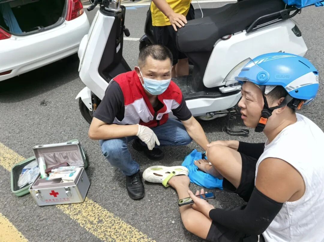 到达伤者身边后,朱艳军和金灿凭借专业素养,第一时间对倒地不起的外卖骑手进行了初步检查。“伤者意识清楚,但表情痛苦,右臂和膝部有明显擦伤,疑似有软组织挫伤。”队员朱艳军补充道,“我们立即分工合作,一人安抚伤者情绪并检查有无其他潜在伤情,另一人快速进行创口清洁和包扎止血。”