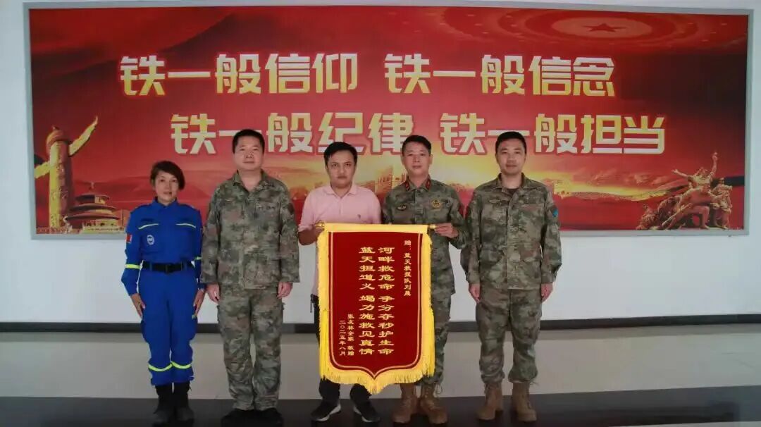 被救者张某(左三)为民兵刘晟(右二)送来锦旗